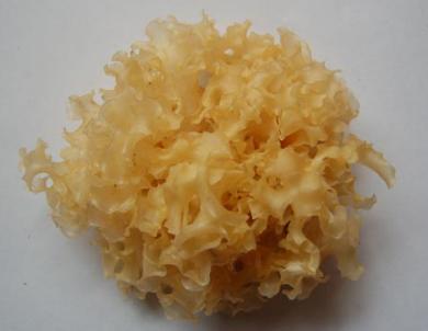 子实体由数片至10余片薄而多皱褶的瓣片组成,呈菊花形、牡丹花形或绣球形,直径3~15cm,白色或类黄色,表面光滑,有光泽,基蒂黄褐色。角质,硬而脆。浸泡水中膨胀,有胶质。气微,味淡。